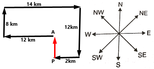 Prabin starts from Point A and drives 12 km towards the west. He then takes a right turn, drives 8 km, turns right and drives 14 km. He then takes a right turn and drives 12 km. He takes a final right turn, drives 2 km and stops at Point P. How far (shortest distance) and towards which direction should he drive in order to reach Point A again?