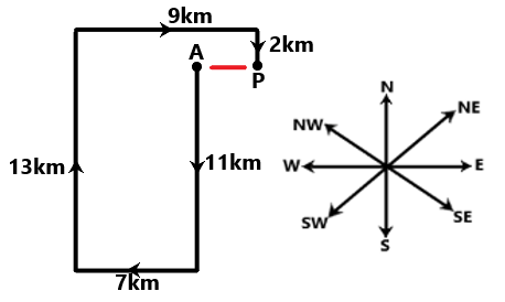 Zakir starts from Point A and drives 7 km towards the South. He then takes a left turn, drives 2 km, turns right and drives 7 km. He then takes a left turn and drives 11 km. He then takes a left turn and drives 8 km. He then takes a left turn and drives 2 turns. He takes a final right turn, drives 6 km and stops at Point P. How far (shortest distance) and towards which direction should he drive in order to reach Point A again? (All turns are 90 degrees turns only unless specified.)