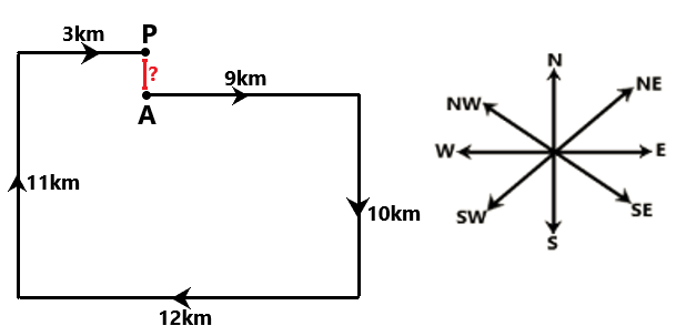 Prakhar starts from Point A and drives 9 km towards the east. He then takes a right turn,drives 10 km, turns right and drives 12 km. He then takes a right turn and drives 11 km.He takes a final right turn, drives 3 km and stops at Point P. How far (shortest distance)and towards which direction should he drive in order to reach Point A again? (All turnsare 90° turns only unless specified.)