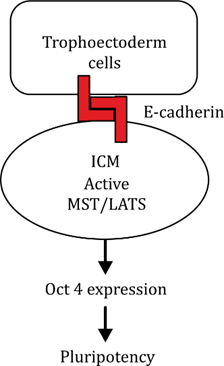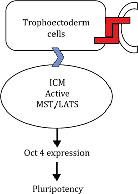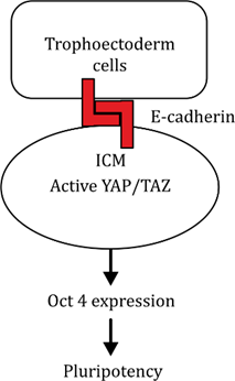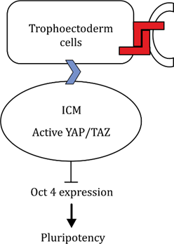 In the ICM, active Hippo → YAP/TAZ inhibited → Oct4 ON → Pluripotency