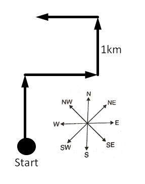 R walks towards north. After a while, he turns to his right and after going little further he turns to his left. Finally, after walking a distance of 1 km more, he turns to his left again. In which direction is he moving now?