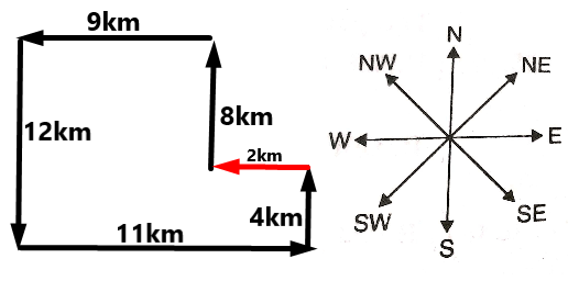 Gautam starts from Point A and drives 9 km towards south. He then takes a right turn, drives 4 km, turns right and drives 11 km. He then takes a right turn and drives 6 km. He takes a final right turn, drives 2 km and stops at Point P. How far (shortest distance) and towards which direction should he drive in order to reach Point A again? (All turns are 90° turns only unless specified.)