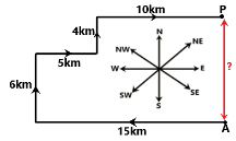 Raj starts from Point A and drives 15 km towards the west. He then takes a right turn, drives 6 km, turns right and drives 5 km. He then takes a left turn and drives 4 km. He takes a final right turn, drives 10 km and stops at Point P. How far (shortest distance) and towards which direction should he drive in order to reach Point A again? (All turns are 90 degrees turns only unless specified.)