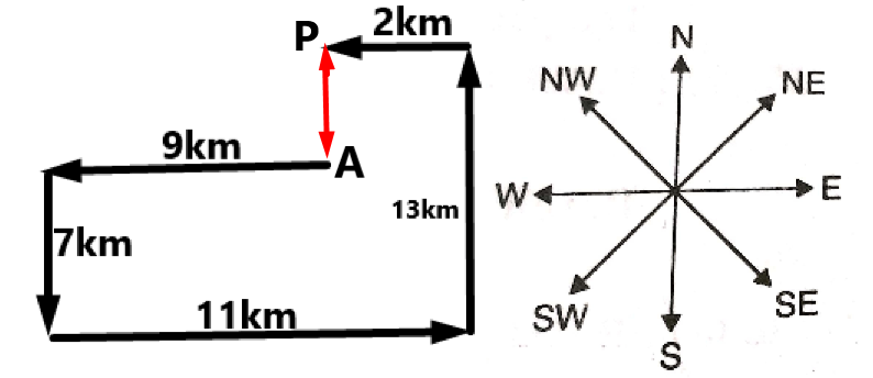 Gautam starts from Point A and drives 9 km towards south. He then takes a right turn, drives 4 km, turns right and drives 11 km. He then takes a right turn and drives 6 km. He takes a final right turn, drives 2 km and stops at Point P. How far (shortest distance) and towards which direction should he drive in order to reach Point A again? (All turns are 90° turns only unless specified.)