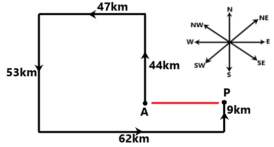 Raman starts from Point A and drives 44 km towards the north. He then takes a left turn, drives 47 km, turns left and drives 53 km. He then takes a left turn and drives 62 km. He takes a final left turn, drives 9 km and stops at Point P. How far (shortest distance) and towards which direction should he drive in order to reach Point A again? (All turns are 90-degree turns only unless specified.)