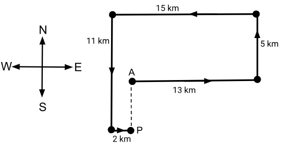 - He then takes a left turn, drives 5 km, turns left, and drives 15 km.