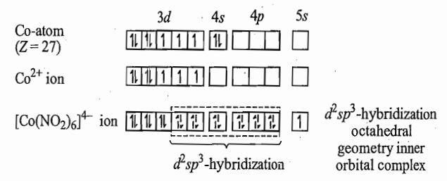 [Co(NO2)6]4- ion: In this complex ion, oxidation state of cobalt is +2 and its valence shell electronic configuration is 3d7 .The (NO2)- ligands are strong, they, therefore, cause pairing of metal 3d- electrons. Pauling suggested that two vacant 3d-orbitals are made available by promotion of an unpaired electron from a 3d-orbital to 5s-orbital.