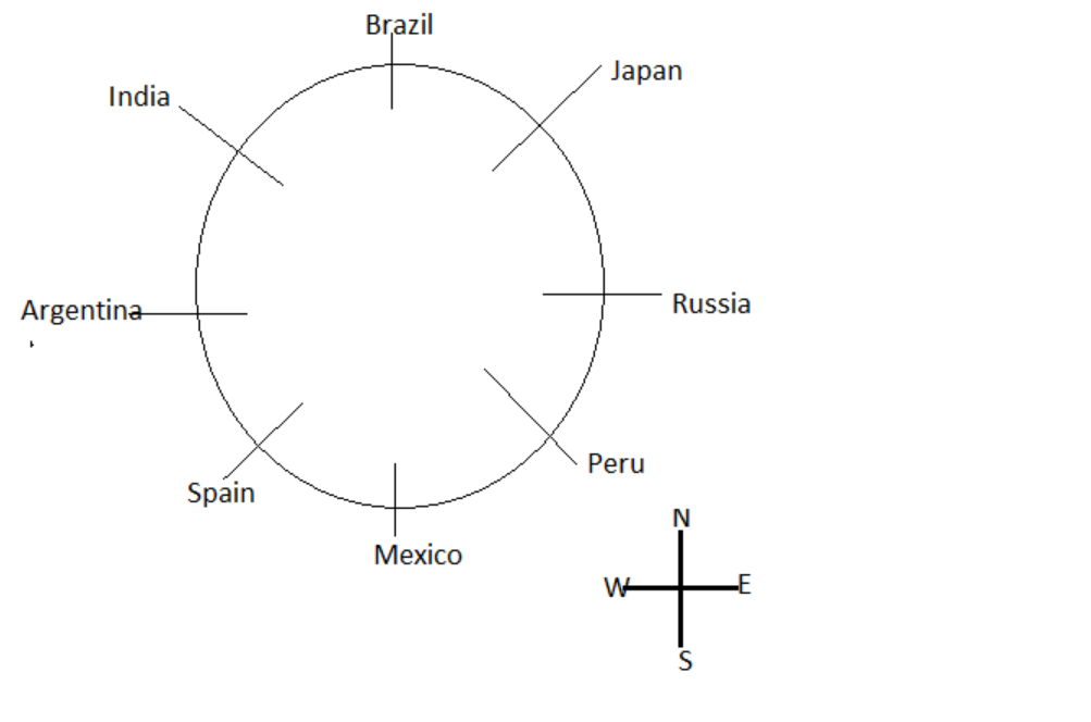 A, B, C, D, E, F, G and H are sitting around a circle at an equal distance facing the centre of the circle.