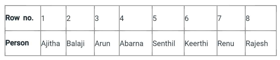 Eight persons— Arun, Renu, Keerthi, Balaji, Abarna, Senthil, Ajitha and Rajesh.