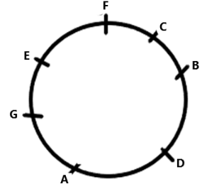 A, B, C, D, E, F, G and H are sitting around a circle at an equal distance facing the centre of the circle.