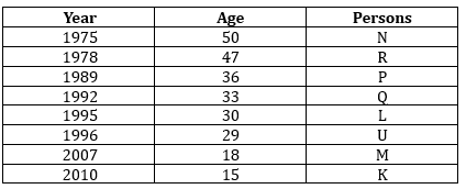 M is three years older to K. Fourteen years age gap between K and U. Total age of K and P is one year more than the age of N. Q’s age is multiple of 3 but Q does not born in odd numbered year. L is younger to Q and R both.