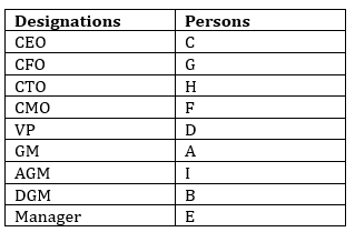 Nine persons A, B, C, D, E, F, G, H, I are designated on different posts in a company but not in given order. The designations are CEO (Chief Executive Officer), CFO (Chief Financial Officer), CTO (Chief Technical Officer), CMO (Chief Marketing Officer), VP (Vice President), GM (General Manager), AGM (Assistant General Manager), DGM (Deputy General Manager), Manager. These designations are given in the decreasing order of seniority from CEO to Manager respectively.