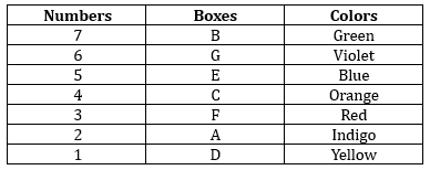 Seven boxes A, B, C, D, E, F, G – are placed one above the other but not in the given order. These boxes are numbered as 1 to 7 from bottom to top respectively. All the boxes are painted with different colors – red, blue, violet, indigo, green, orange, yellow (but not in same order as given).