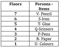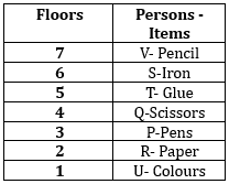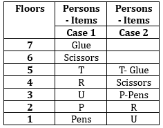 Clues: The number of persons live above the one who has scissors is one more than the number of persons lives below the one who has Pens. One person was born between the one who has Pens and U. P lives on a prime number floor below T.