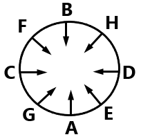8 people – A, B, C, D, E, F, G, H – are sitting at a round table facing each other.