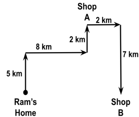 Read the given paragraph carefully and answer the question. Ram walks 5 km straight from his home. After taking a right turn he walks for another 8 km. He then takes a left turn and reaches shop A after 2 km. From there he takes a right turn and walks 2 km. He covers another 7 km to the right to reach shop B. What is the distance covered by Ram to reach shop A from his home?
