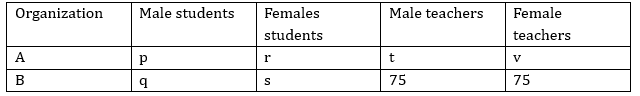 The information is about the total number of student and teacher in two organisation A and B. Total people in organisation B is 500. The total student in organisation A is equal to the male teacher in A . Male student in A is half of the female teacher in A. The sum of male student and female teacher in A is equal to the male student in B. The male and female teachers in B are equal, which is 25 more than female student in B. Female teacher in B is 75 and total females in both the organisation is 350.