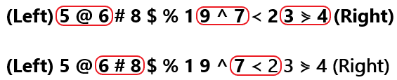(Left) 1 & 9 6 > 7 5 * 7 + 5 ^ 7 0 * 4 % $ (Right)