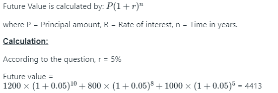 Renubala deposits Rs. 1200 now, Rs. 800 two years from now and Rs. 1000 five years from now. If the savings bank's rate of interest is 5%, she will re