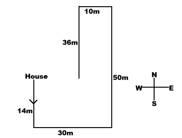 ​Rishabh starts from his house and walks 14 m southwards. Then, he turns left and walks 30 in. Then he turns left and walks 50 in Then he turns left and walks 10 m. He then tums left and walls 36 m. In which direction and how many meters away is he now from his house?
