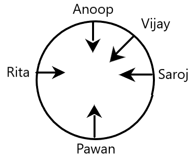 Rita, Saroj, Pawan, Vijay and Anoop are sitting around a circular table facing towards the centre. Pawan is sitting immediately left of Saroj and second to the right of Anoop. Rita is sitting immediately left of Pawan. Who is sitting immediately right of Vijay?