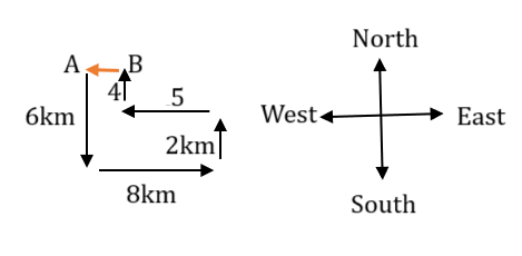 Robert starts from Point A and drives 6 km towards South. He then takes a left turn, drives 8 km, turns left and drives 2 km. He then takes a left turn and drives 5 km. He takes a final right turn, drives 4 km and stops at Point B. How far (shortest distance) and towards which direction should he drive in order to reach Point A again? (All turns are 90 degree turns only unless specified.)