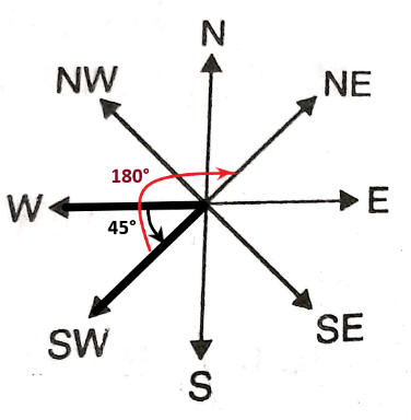 Rohan is facing west. He turns 45 degrees anti-clockwise and then turns 180 degrees towards his right. In which direction is he facing now?