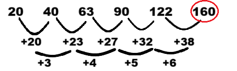 Logic: Difference of two constitutive number is increasing 20, 23, 27, 32, 38