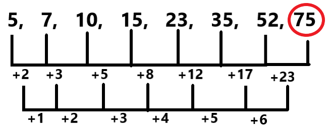 Given: 5, 7, 10, 15, 23, 35, 52, ?