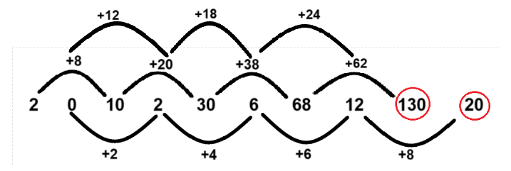 2, 0, 10, 2, 30, 6, 68, 12, ?, ?