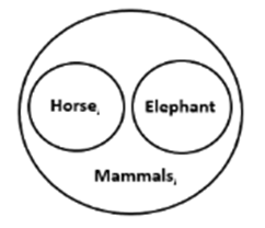 Two non-overlapping smaller circles inside the Mammals circle, one labeled Horse and the other labeled Elephant.