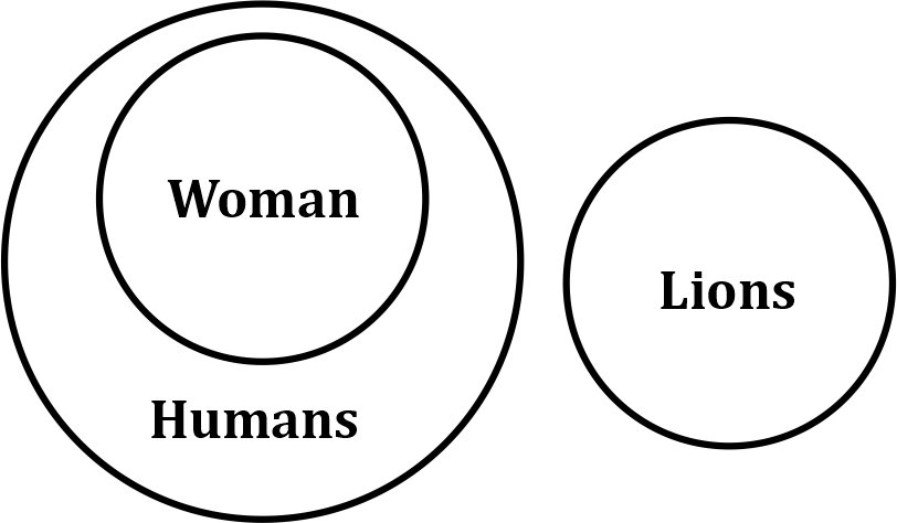 As we know all woman are humans while lions are animal. Thus, the correct Venn diagram of the given information is given below as-