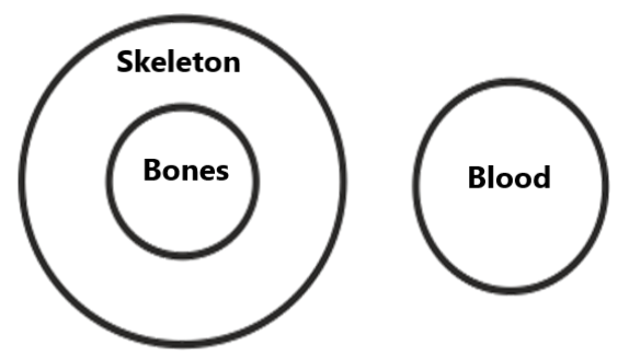 ​Select the Venn diagram that best represents the relationship between the given set of classes.Blood, Skeleton, Bones