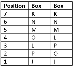 Seven boxes J, K, L, M, N, O and P are kept one over the other but not necessarily in the same order. Only five boxes are kept between K and J. L is kept immediately above P. M is kept immediately below N. O is kept at one of the positions above J. N is kept immediately below K. How many boxes are kept between N and J ?
