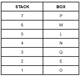 Seven boxes, L, M, N, O, P, Q, and E, are kept one above the other but not necessarily in the same order. L is fifth from the bottom in the stack. M is immediately above L. Only three boxes are there between O and L. Only two boxes are there between P and N. N is immediately above Q. P is at one of the positions above N. Which box is kept at the sixth position from the bottom?
