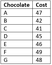 Seven chocolates A, B, C, D, E, F and G are bought at different costs between 40 and 50 (excluding 40 and 50) but not necessarily in the same order. The cost of chocolate C is five less than that of chocolate E. The cost of the chocolate A is a prime number. The cost of chocolate F is two more than that of chocolate A. The cost of chocolate F is more than that of chocolate E. The cost of chocolate D is an odd number. The cost of chocolate G is three more than the cost of chocolate D. None of the chocolates costs 44. The cost of chocolate B is an even number. Which of the following chocolates is costlier than E?