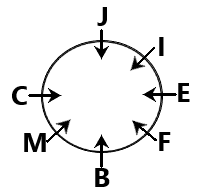 Seven colleagues B, C, E, F, I, J, and M are sitting around a circular table facing the centre. C sits second to the left of B and B sits to the