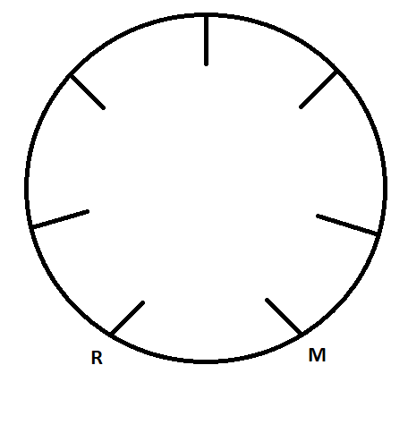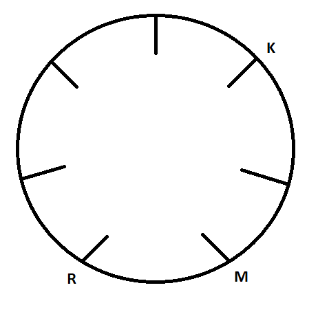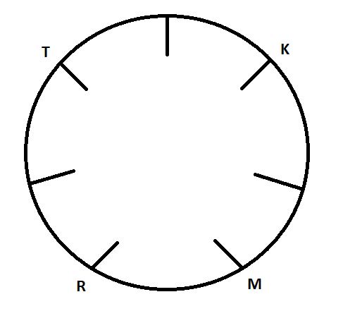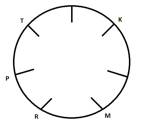 Seven friends are sitting in a circle facing the center. R is sitting to the immediate left of M. K is second to the right of M. T is sitting between R and K. P is not sitting next to K or M. Who is sitting to the left of P?