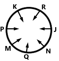 Seven friends M, N, J, K, P, Q and R are sitting in a circle facing at the centre but not necessarily in the same order.