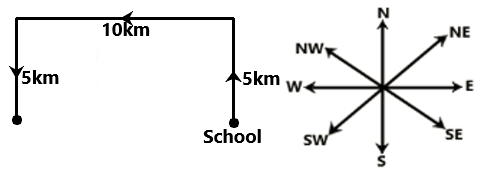 Shyam goes 5 km in the North from his school. Now, turning to the left, he goes to 10 km and again turns to left and goes to 5 km. How far he is from his school and in which direction?