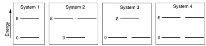 The energy level having zero energy has two particles. The energy level having ε energy has two particles. Finally, the energy level having 2ε energy has two particles. Thus, total energy= 2×0+2×ε+2×2ε=6ε.