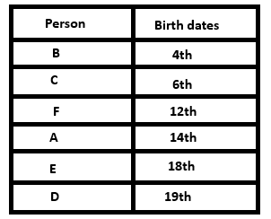 Six persons: A, B, C, D, E, and F, were born on different dates: 12th, 14th, 18th, 19th, 4th, and 6th of the same month.