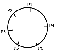 · Six persons P1, P2, P3, P4, P5, and P6 are sitting around a circular table, all facing the center.