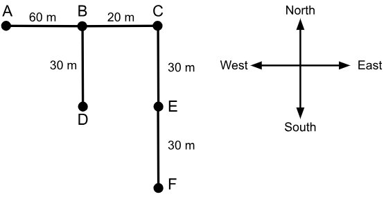 He again turns and walks 40 metres in south-east and finally he turns again towards his house.