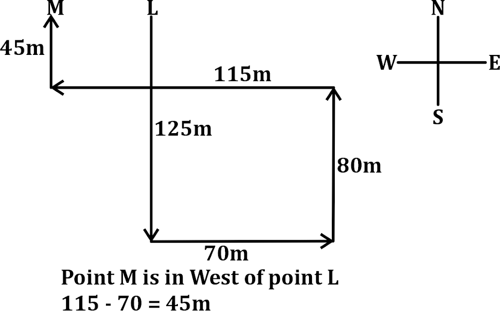Starting from point L, a person walks 125" " m towards the south. He then takes a left turn and walks 70" " m. From there, he takes a left turn and walks 80" " m. After that, he takes a left turn and walks 115" " m. Finally, he takes a right turn and walks 45" " m to reach point M. How far and in which direction is point M from point L ? (All turns are 90 degree turns only)