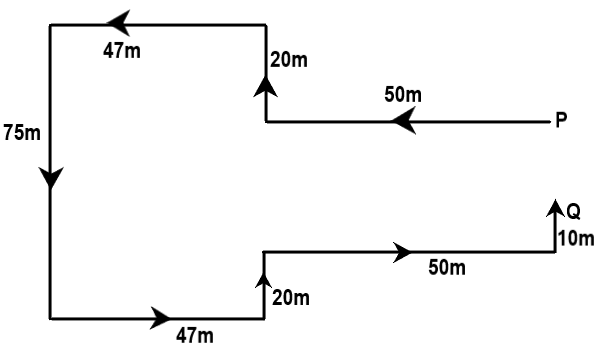 Starting from point P, Sheetal walks 50 m towards the west. She takes a right turn and walks 20 m. Then she takes a left rum and walks 47 m, She takes a left turn again and walks 75 m. Again. she takes a left turn and walks 47 m, She takes a left turn again and walks 20 m. Then she takes a right turn and walks 50 m. Finally. she takes a left tum and walks 10 m reach point Q. How far and in which direction is point P from point Q? (All turns are 90 degree turns only)