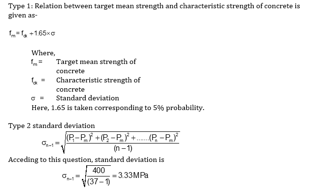 Statistical based quality control for concrete is carried out for a highway project in which 37 concrete samples were tested randomly. The average strength was found to be 40 MPa with a square of deviation of 400 MPa². What is the standard deviation of the test samples?