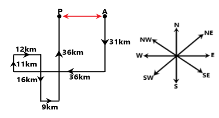 Stu starts from Point A and drives 31 km towards south. He then takes a right turn, drives 36 km, turns right and drives 11km. He then takes a right turn and drives 12 km. He then takes a right turn, drives 16 km, turns left and drives 9 km. He takes a final left turn, drives 36 km and stops at Point P. How far (the shortest distance) and towards which direction should he drive in order to reach Point A again? (All turns are 90° turns only, unless specified.)