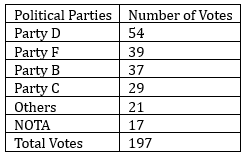 Clearly, winning party is Party D with 54 votes