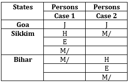 Clues: J lives in Goa. H doesn’t live in the same state as J. H and E lives in the same state. M doesn’t live in the same state as J.
